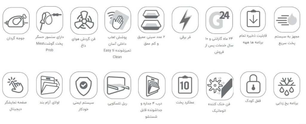 بعد و یا هنگام پخت و پز توسط شما عزیزان در این فر، فن فعال میشود و با خنک کردن قطعات فر مانع از آسیب رسیدن به بخش ها و یا قطعات مختلف فر بر اثر گرما میشود.