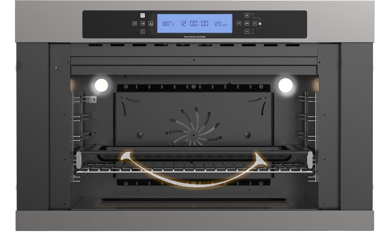 فن گردش هوای داغ فر توکار ، هوای گرم را به کل محفظه رسانده و سبب میشود که یکنواختی در پخت غذا و شیرینی فراهم شود. بدین ترتیب کیفیت پخت بالا میرود. با این آپشن، هوای داغ به صورت یکسان در محفظ فر به گردش درآمده و شرایط مناسبی را برای پخت فراهم میکند.